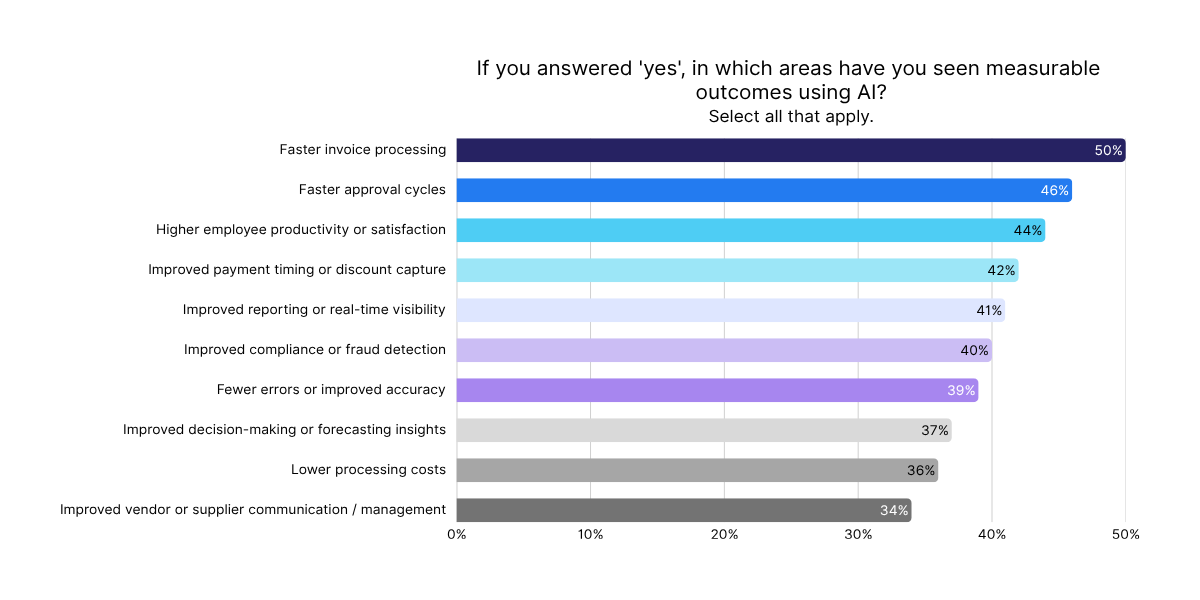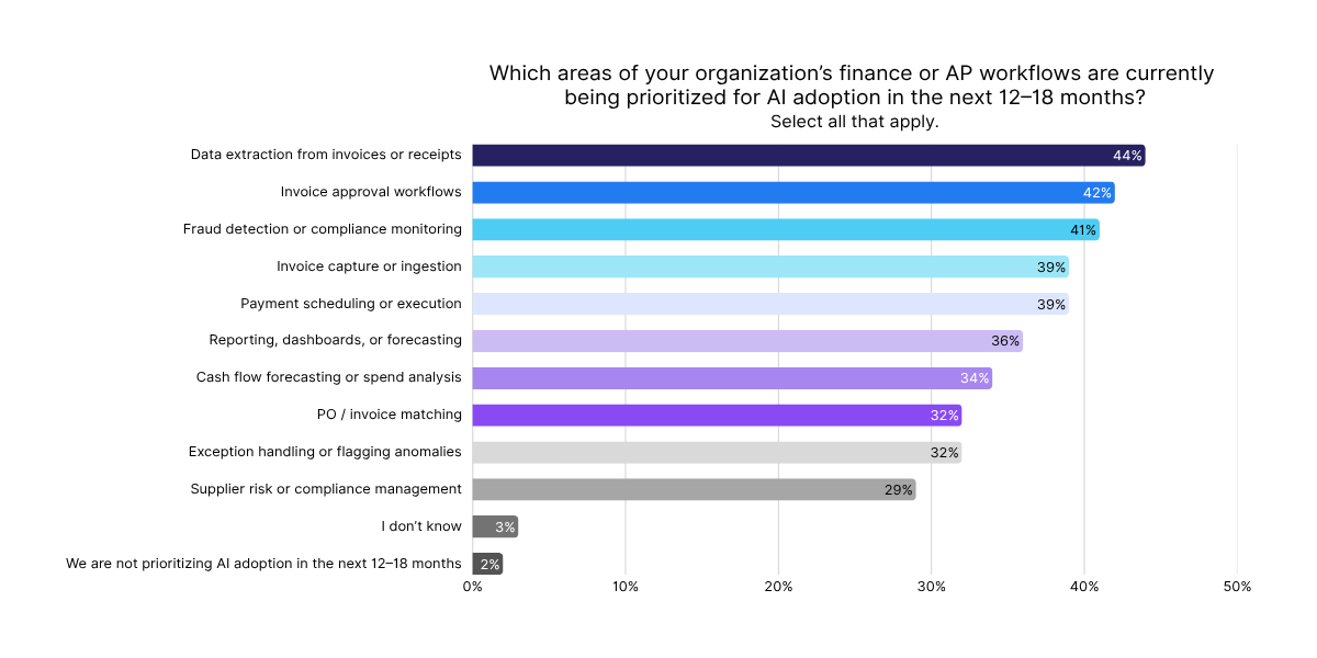 Other areas like invoice capture (40%) and fraud detection (40%) are close behind, demonstrating that finance teams aren’t just using AI for efficiency, but also to strengthen accuracy, compliance, and control.